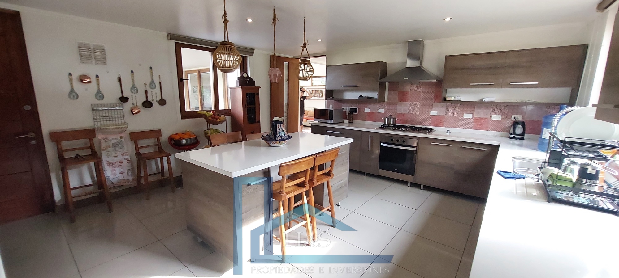 Exterior: Jardín formado con riego automático, terraza techada, piscina con sector para reposeras, quincho con mesón tipo bar, 2 parrillas, horno de barro, bodega, Juegos infantiles cancha de tenis, muro de escalada, casa de muñecas, estacionamiento techado para 2 autos mas 10 autos sin techo aprox.